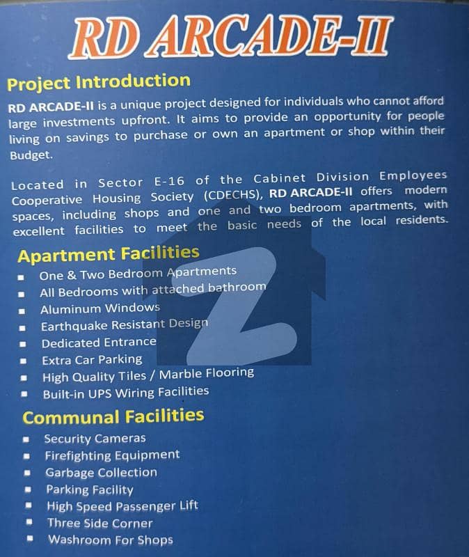 RD Arcade-II is a premium residential and commercial project located in the prime area of Sector E-16 (CDECHS). Designed for smart living and profitable investment, it offers modern apartments and offices in multiple sizes to suit every business need. With quality construction, contemporary facilities, and a strategic location, RD Arcade-II is the perfect choice for investors and end users alike. Possession is assured within two years.