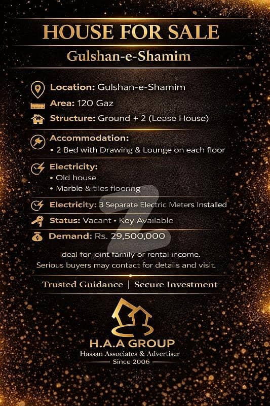 Gulshan-e-Shamim 120 Gaz Ground+2 house Ground 2 bed drawing launj passage first floor 2 bed drawing launj terrace separate Metor second floor 2 bed drawing launj separate Metor 3 kitchen only family visit lease house sweet water only family visit slightly negotiable