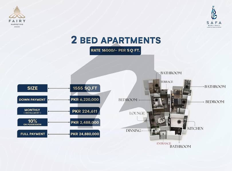 Prime location in B-17 with easy access to main Margallah avenue GT road Landmark high-rise design with a modern faade Spacious 2-bedroom apartments with attached luxury bathrooms High-quality fittings, stylish kitchens, and elegant flooring Dedicated parking, 24/7 security, and backup power Commercial mall within the building for ultimate convenience