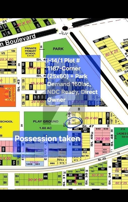I-14/1 Plot # 423-Corner (25x60) 50ft Rd, Direct Owner 165lac, 100% confirm