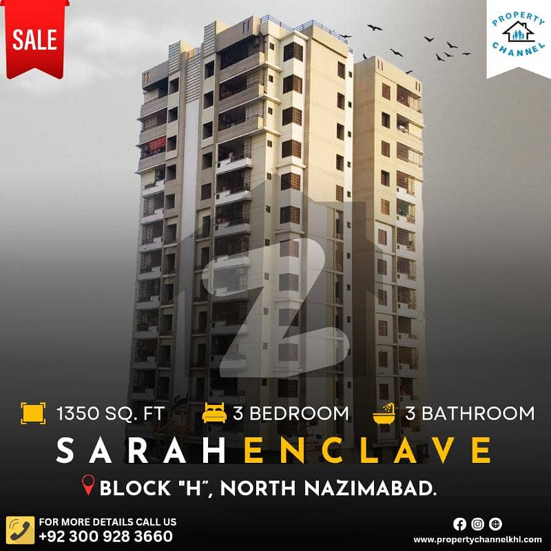1350 Square Feet 3 Bedrooms Attached Bath Drawing Lounge West Open Double Lift Cargo Lift Standby Generator Car Parking Prime Location SARAH ENCLAVE BLOCK H NORTH NAZIMABAD.