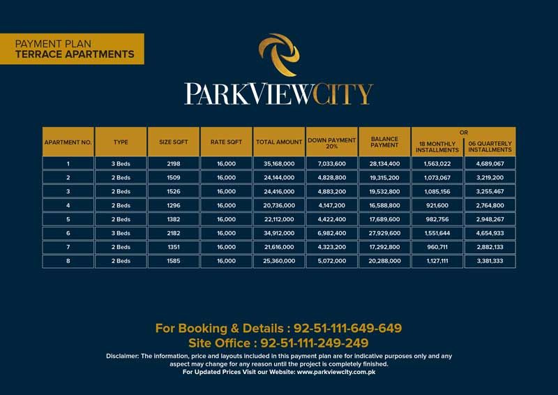 Terrace Apartments are another attractive investment in Park View City Islamabad. They overlook the beautiful botanical garden next door. As the name suggests, Terrace Block comprises apartments that provide all fundamental amenities and facilities to the residents from exclusively furnished lobbies to spacious 1-,2-, and 3-bedroom apartments for families. Developers came up with the notion to make compatible living spaces for small families within limited budget.