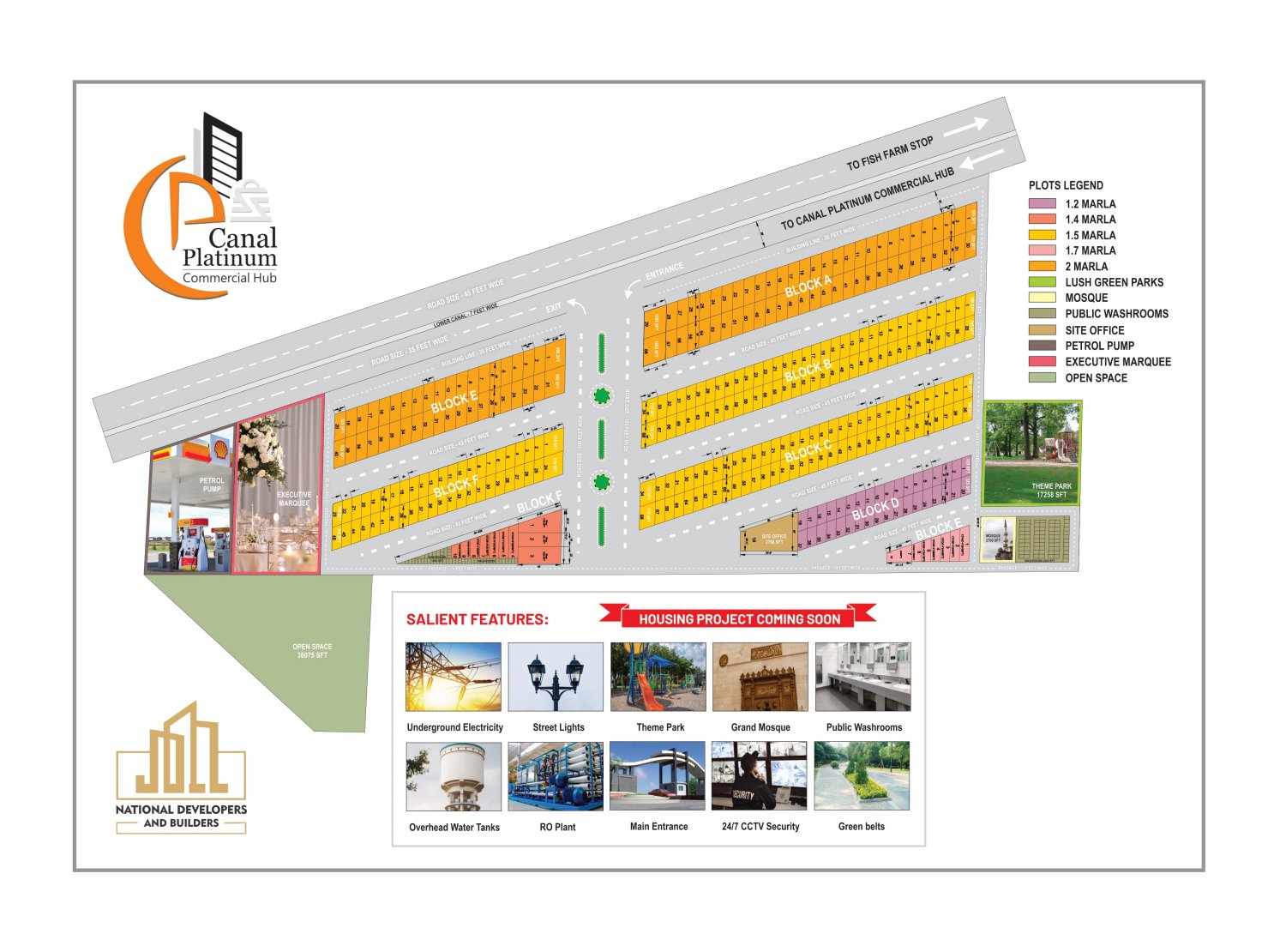 There is also a sophisticated and well-planned underground electricity system, a 100-foot main entrance, a 45-foot wide road network, constant water supply through overhead water tanks, the project's own water treatment facility, and 24/7 CCTV surveillance.
