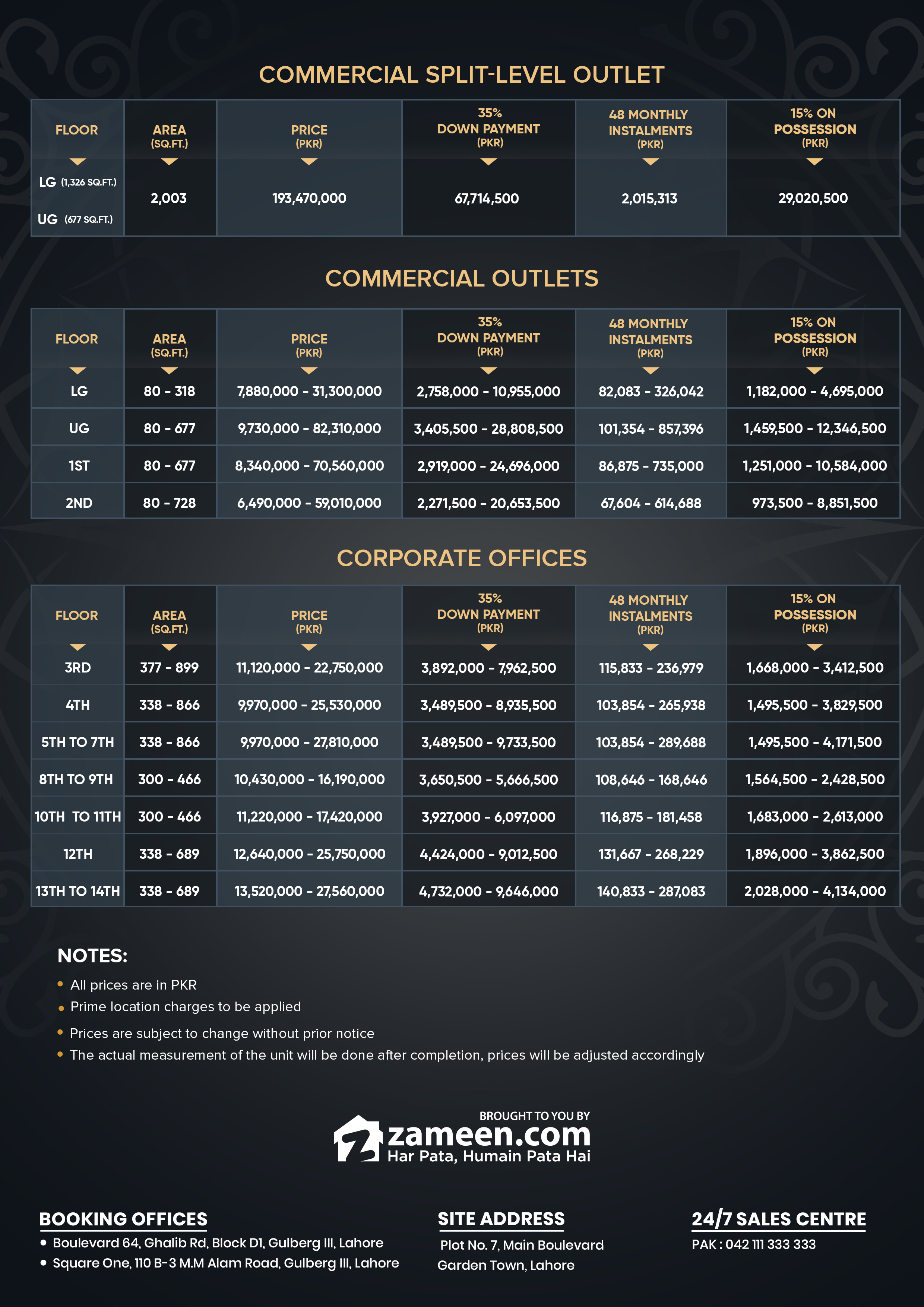 Madison Square Offices enjoys a strategic location on Main Boulevard, Garden Town, offering excellent visibility and connectivity across Lahore: