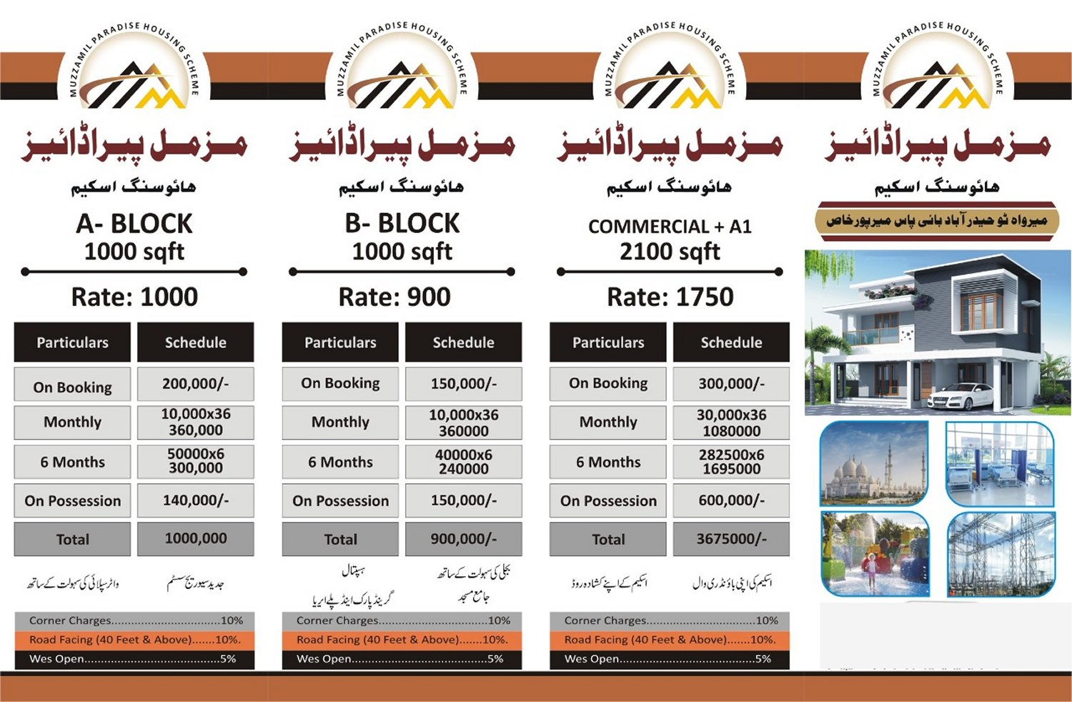Muzammil Paradise Housing Scheme is planned to deliver a harmonious, suburban life quality to all its residents. It is also equipped with the essentials to ensure that anyone who is visiting or living in this housing scheme, is given a nurturing and secure atmosphere that promotes wellbeing. The project is accepting bookings and the interested parties will have to hurry to secure their plots before the project is all sold out.