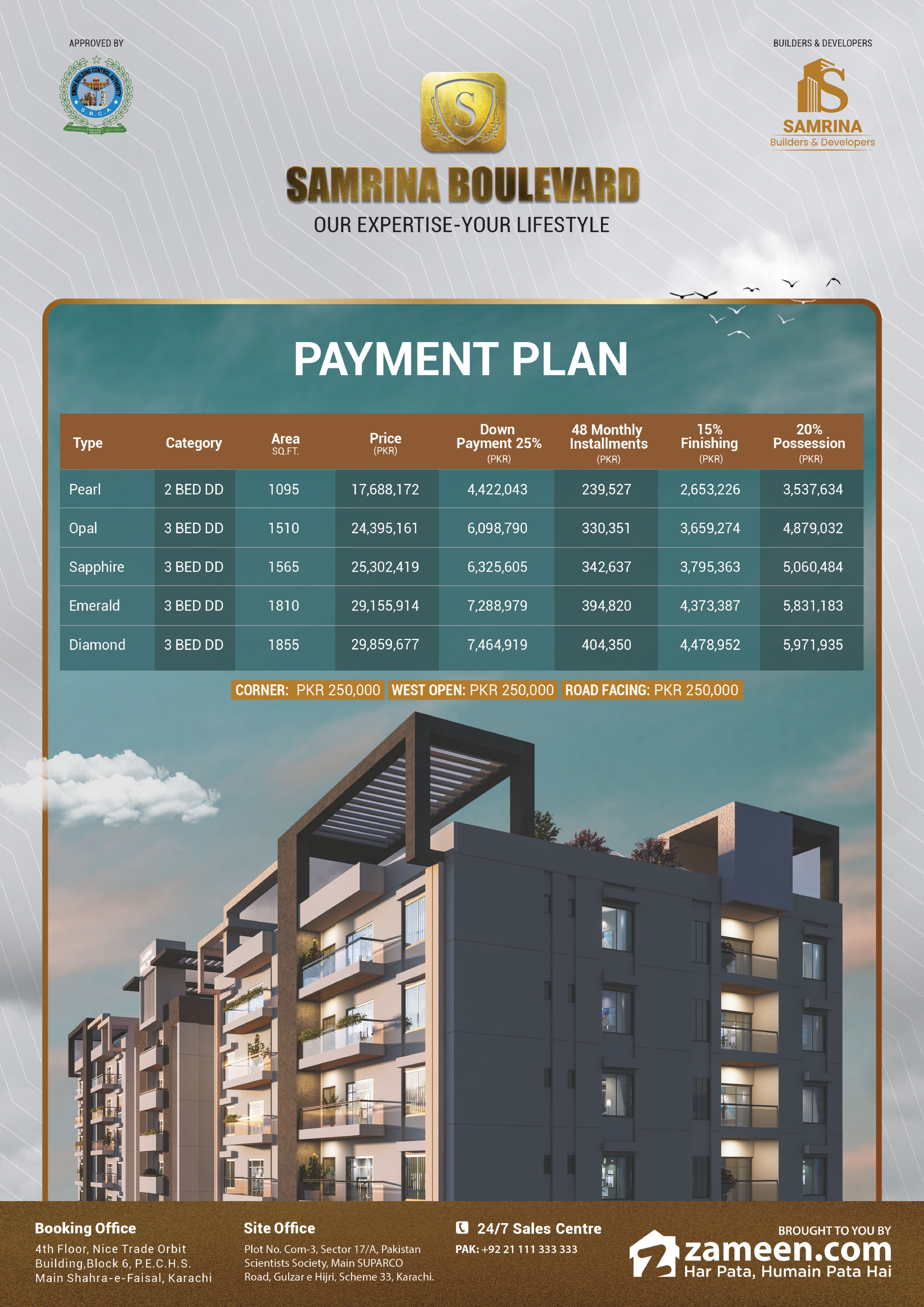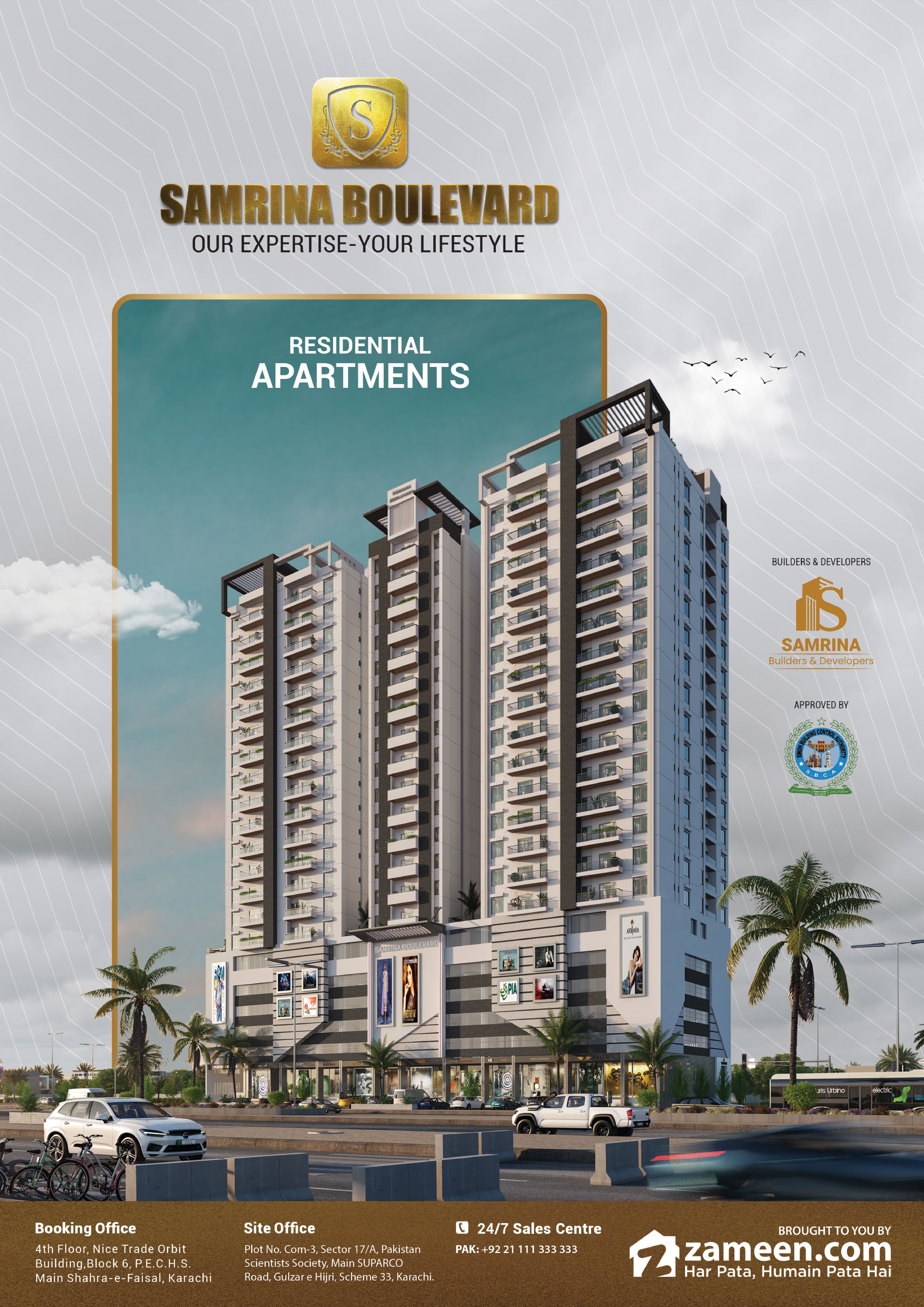 Samrina Boulevard is an exceptional mixed-use development in Karachi’s Scheme 33 that promises a premium urban lifestyle for apartment seekers and investors alike. Developed by Samrina Group, a trusted name with over 15 years of real estate excellence, the project spans B+G+20 floors and offers a modern blend of commercial and residential spaces. With commercial showrooms in the basement and ground floor, five dedicated parking levels, and 15 floors of luxury apartments, Samrina Boulevard is designed to meet the needs of those who value comfort, convenience, and quality.