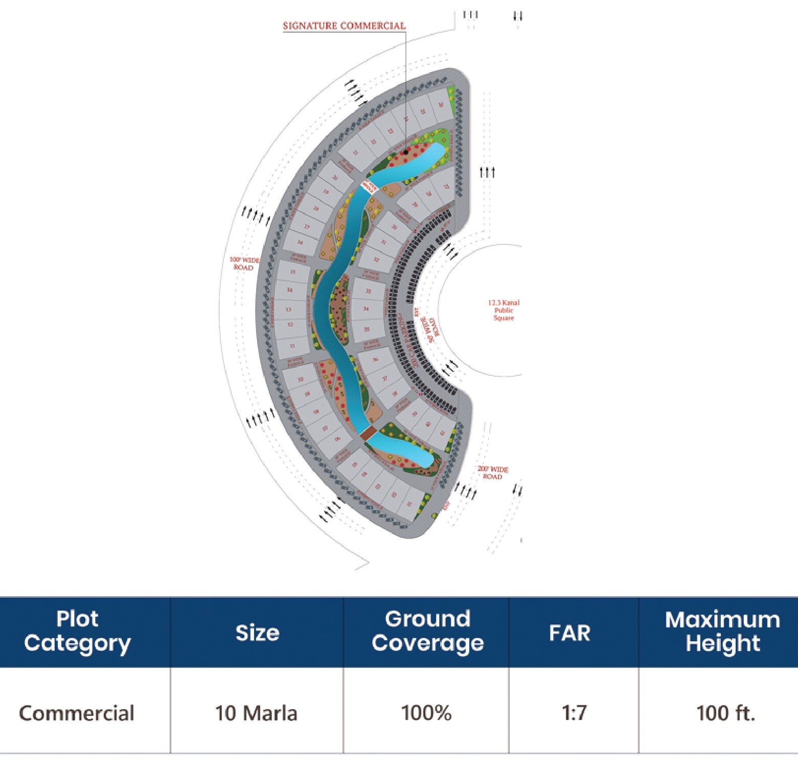 - Premium commercial plots with allowance for 100% ground coverage and a height of up to 100 feet
