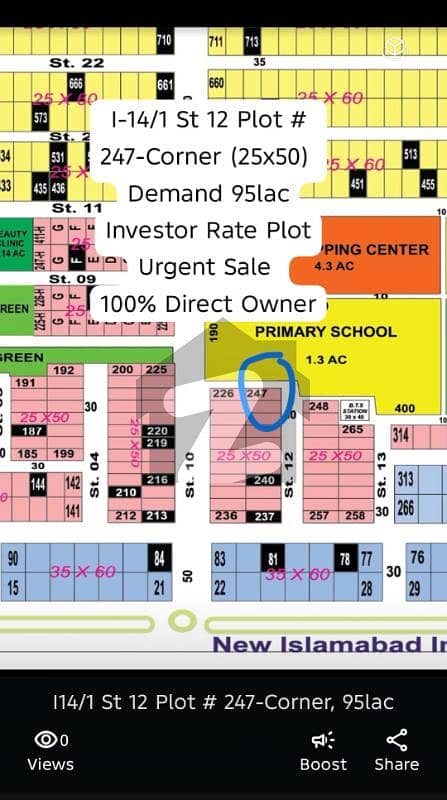I-14/4 St 73, Plot # 225-Corner (25x50) 110lac, Direct Owner, Face to Face meeting with owner Possible