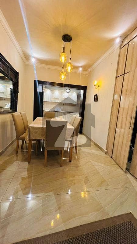 The apartment features two spacious master bedrooms with attached washrooms, a drawing room with separate powder room, a comfortable lounge, and a fully equipped kitchen. Tastefully furnished with quality furniture and fittings, this apartment is move-in ready.